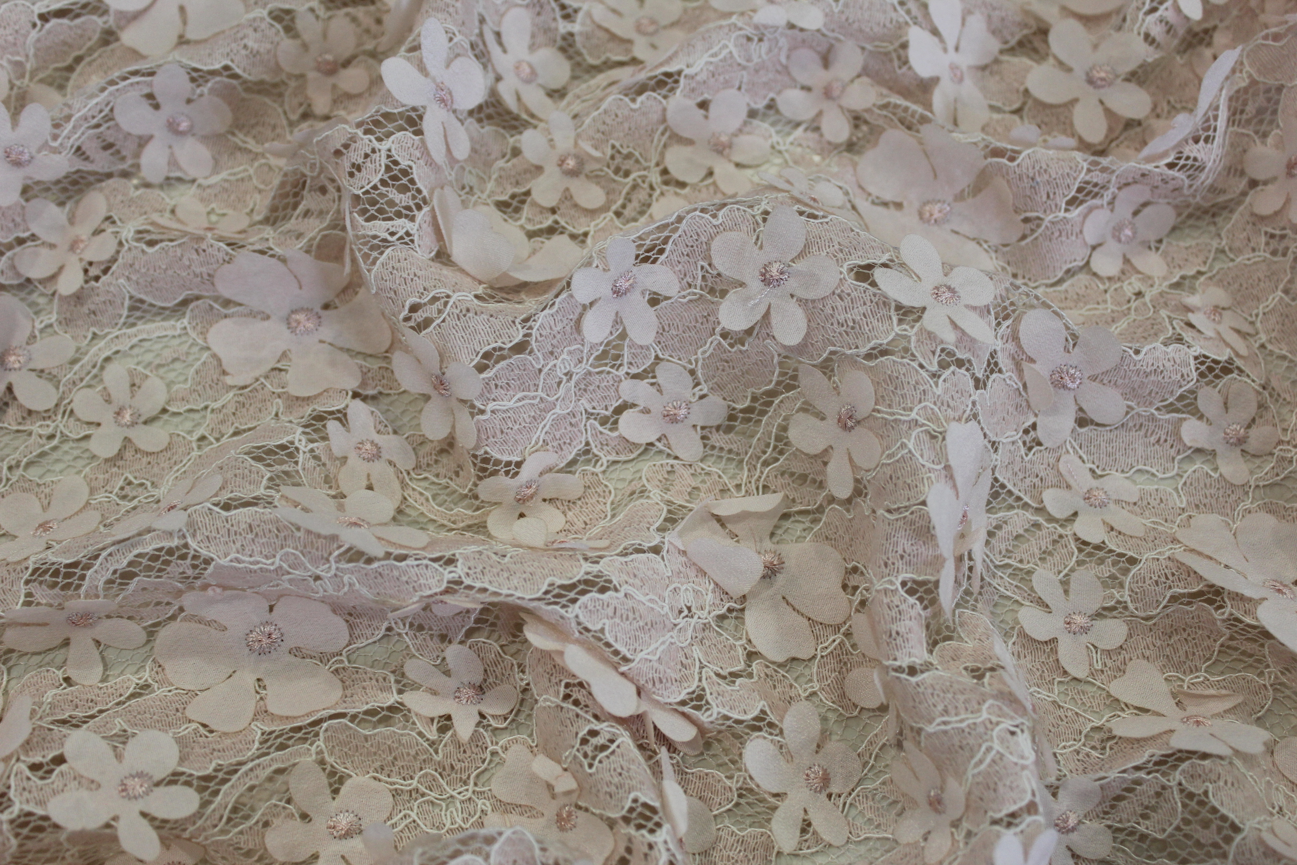 Сетка с цветочным оригинальным узором. Она имеет приятный неброский персиковый оттенок. Это эластичный материал, который прекрасно растягивается по длине и ширине, имеет достаточное пространство между нитями плетения.